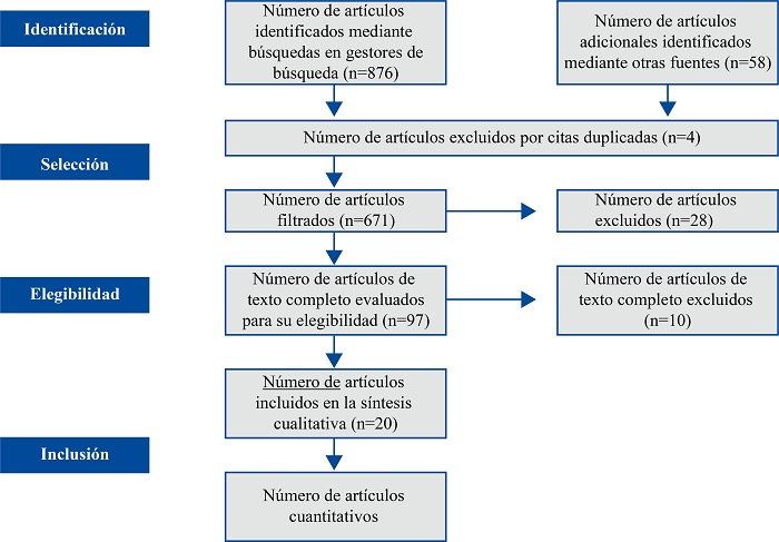 Para la metodología de selección de artículos se realizó la clasificación por medio de la discriminación: inicialmente por títulos, posterior a eso se filtró la selección de los artículos por medio de los resúmenes y finalizando se revisó el texto completo de cada artículo; continuando con la revisión sistemática se aplica la declaración (PRISMA) que sus siglas significan: Preferred Reporting Items for Systematic Reviews and Meta-Analyses, que propone los siguientes pasos: identificación, cribado, idoneidad e inclusión, gracias a esto se pudieron identificar varios factores que se mencionaran en los resultados15.