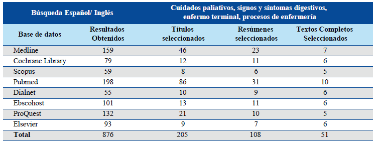 La revisión de literatura se realizó en el primer semestre del 2018 específicamente durante los meses de marzo a mayo de 2018, la investigación de artículos fue realizada en las bases de datos Medline, Cochrane Library, Scopus, Pubmed, Dialnet, Ebscohost, ProQuest y Elsevier, Gracias a que se utilizaron los operadores lógicos OR y AND con sus respectivos truncadores, se pudo utilizar los términos clave de búsqueda por medio de los tesauros Decs: Cuidados paliativos (E02.760.666, N02.421.585.666), signos y síntomas digestivos (C23.888.821), enfermo terminal (M01.873), procesos de enfermería (N04.590.233.508); Mesh: Palliative Care, Signs and Symptoms, Digestive, Terminally Ill, Nursing Process.
