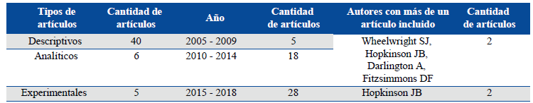 En la Tabla 2, se presenta los tipos de artículos que se seleccionaron que fueron 3 como son descriptivos, analíticos y experimentales en el rango de las fechas de publicación de los artículos y las cantidades obtenidas en total, se realiza un agregado de los autores que se tuvieron en cuenta con más de una publicación pero que fuera un estudio totalmente diferente.