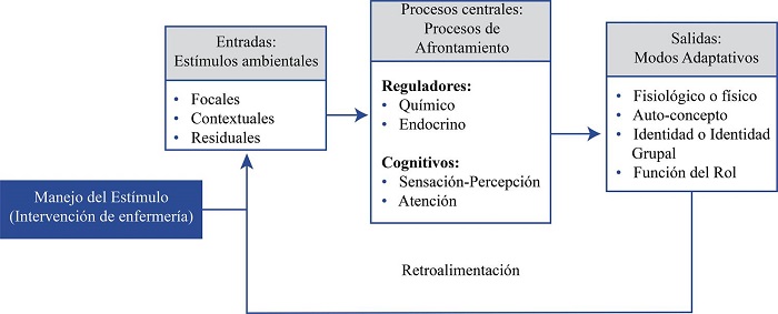 A su vez se establece que los procesos de adaptación en una persona están mediados por los mecanismos de afrontamiento que posea, como respuesta ante diferentes estímulos que, en la propuesta teórica de Roy, pueden ser de tres tipos: focales, contextuales y residuales. Así mismo los procesos de afrontamiento pueden ser de tipo regulador, en los que intervienen procesos neuronales, químicos y endocrinos, y por tanto se les denomina inconscientes; y de tipo cognitivo, que incluyen el procesamiento perceptual, el aprendizaje, el juicio y la emoción, y proporcionan una interpretación de la situación. A su vez, el proceso de interacción entre los estímulos y los procesos de afrontamiento arroja como resultado cuatro posibles formas de adaptación, respuestas adaptativas que se manifiestan a manera de características de tipo fisiológico, en el autoconcepto-autopercepción de cada sujeto, en función del rol y de la interdependencia22.