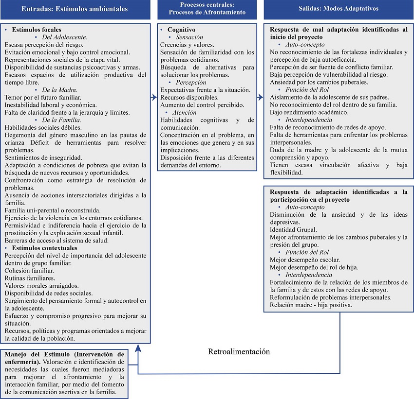 Partiendo de los postulados y elementos centrales que propone Roy en su modelo, se presenta a continuación (Figura 2) el análisis de la aplicación de los conceptos de dicho modelo, dentro de la situación de Enfermería desarrollada. En primer lugar, se pueden observar en las entradas del sistema los estímulos ambientales de tipo focal y contextual identificados dentro de la situación de Enfermería. En el caso de los estímulos focales, fueron clasificados de acuerdo a lo que el sujeto de cuidado (adolescente, madre y familia en su conjunto) manifestaba. Todos estos elementos van a definir sus experiencias y conocimientos. Los estímulos contextuales abordan las características de un entorno vulnerable.
