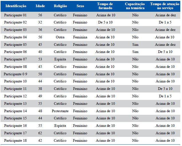 Por meio da análise dos dados, no primeiro momento foi realizado a caracterização dos sujeitos segundos os itens contidos no questionário sociodemográfico. A organização dos dados seguiu o padrão de tabelas contendo identificação, idade, religião, sexo, tempo de formado, capacitação na temática e tempo de atuação. Dessa forma é possível ver as associações entre as variáveis ( Quadro 1 ).