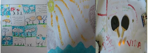Os relatos sobre as produções artísticasapresentam-se imbuídos da surpresa com a experimentação: a gente podia fazer isso mais vezes, foi importante estarmos juntas para pensar o cuidado (E-1). Pontuam aquilo que puderam imaginar e produzir, E-5 explicando a história em quadrinhos diz: eu não sabia o que pensar sobre cuidado, eu não sei conversar com os pacientes. Ai, vendo a bacia com água lembrei da chuva, que me levou para casa, ficar deitada fazendo o que gosto ... gosto de ler. Será que poderia ler gibis com eles?