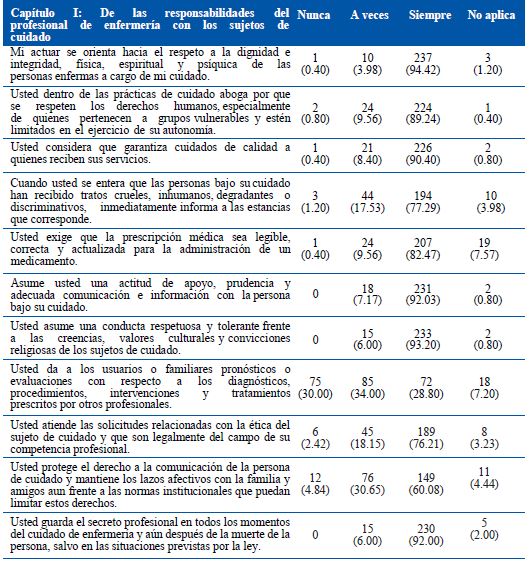 Con respecto al Capítulo I, de las responsabilidades del profesional de enfermería con los sujetos de cuidado, los ítems referidos en este apartado tienen relación con el cuidado humano, como un valor, un bien que legitima el actuar y que permite establecer un compromiso verdadero por otro ser humano20 . De acuerdo a los hallazgos de este estudio, las enfermeras perciben este compromiso en un importante porcentaje en varios de los ítems evaluado. Estos hallazgos podrían ser resultado del entorno en cual se desarrolla la práctica de enfermería, dado que en la literatura científica se ha referido que el entorno de trabajo influye en la práctica ética más que en los valores y preocupaciones éticas21 , así como entornos de trabajo positivos donde la enfermera puede ser más autónoma, con mejores relaciones con compañeros, muestran una mayor satisfacción en los pacientes con los cuidados recibidos22 .