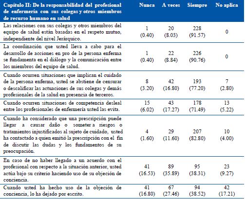 Para las responsabilidades del profesional de enfermería con sus colegas y otros miembros de recurso humano en salud, en la Tabla 2 , se observa que los ítems de este capítulo fueron los que obtuvieron menor porcentaje de cumplimiento en la categoría de siempre. Se aprecia que el ítem que obtuvo la mayor frecuencia (91.57%, n=228) en la categoría de siempre fue Las relaciones con sus colegas y otros miembros del equipo de salud están basadas en el respeto mutuo, independiente del nivel Jerárquico. mientras que las de menor frecuencia de cumplimiento fueron En caso de no haber llegado a un acuerdo con el profesional con respecto a la situación anterior, usted actúa bajo su criterio haciendo uso de su objeción de conciencia y Cuando usted ha hecho uso de la objeción de conciencia, lo ha dejado por escrito, con un valor del 38.31% (n=95) y 38.52% (n=94) en la categoría de siempre; 35.89% (n=89) y 27.46% (n=67) en la categoría a veces; 16.53% (n=41) y 16.80% (n=41) en la categoría nunca respectivamente.