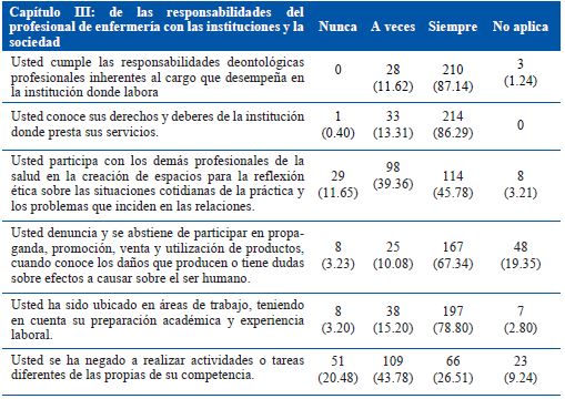 Con respecto a las responsabilidades del profesional de enfermería con las instituciones y la sociedad, en la Tabla 3 , se observa que los ítems más destacados fueron aquellos que tienen una fuerte relación con la forma como las enfermeras asumen el ejercicio del rol durante el desarrollo de la práctica, es así como el ítem con un cumplimiento de siempre que obtuvo una mayor frecuencia (87.14%, n=210) fue Usted cumple las responsabilidades deontológicas profesionales inherentes al cargo que desempeña en la institución donde labora mientras que las de menor frecuencia de cumplimiento fue Usted se ha negado a realizar actividades o tareas diferentes de las propias de su competencia , con un valor del 26.51% (n=66) en la categoría de siempre; 43.78% (n=109) en la categoría a veces; 20.48% (n=51) y en la categoría nunca.