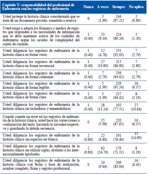 De acuerdo a lo referido en las responsabilidades del profesional de enfermería con los registros de enfermería, en la Tabla 4 , se observa que los ítems de este capítulo fueron los que obtuvieron mayor porcentaje de cumplimiento en la categoría de siempre, lo cual es coherente con un buen desempeño en la práctica, pues estos aspectos de los registros clínicos son considerados las evidencias de la contribución de enfermería en el cuidado de una persona y los que permiten dar fe de un ejercicio idóneo a la hora de una situación ético-legal. Al respecto el ítem con un cumplimiento de siempre que obtuvo una mayor frecuencia (97.21%, n=244) fue Usted protege la historia clínica considerando que se trata de un documento privado, sometido a reserva. mientras que el de menor frecuencia de cumplimiento fue Usted diligencia los registros de enfermería de la historia clínica sin utilizar siglas, distintas a las internacionalmente aprobadas, con un valor del 71.31 % (n=179) en la categoría de siempre; 24.70% (n=62) en la categoría a veces y 0.80% (n=2) en la categoría nunca.