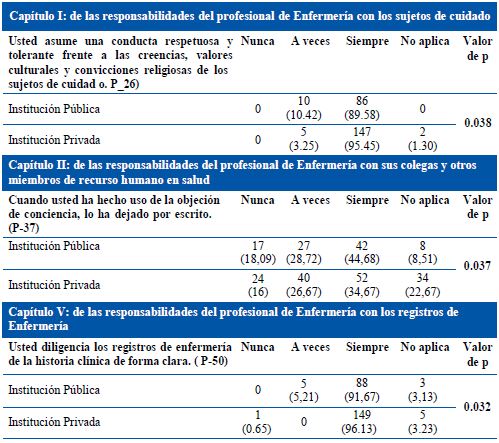 Conclusions: Nursing practice involves a series of ethical responsibilities with the people in care that can vary depending on the context in which it is performed. This study found that the nursing records, conscientious objection, location based on experience and academic education are key factors of nursing practice related to the institution and service where nurses work.