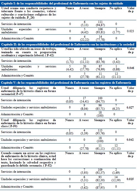 Al análisis estratificado, se encontró que algunos de los ítems descritos anteriormente tuvieron una relación estadísticamente significativa con la entidad donde laboraban las enfermeras y con el servicio donde se desempeñaban. En este sentido, se encontró relación significativa con valores de p semejantes entre la percepción de las enfermeras en lo relacionado con conducta respetuosa, objeción de conciencia y diligenciamiento de registros en forma clara versus la institución donde labora, aspectos que indican cierto grado de autonomía en el ejercicio de la práctica y transparencia a la hora de registrar las acciones producto del quehacer diario. A continuación, se muestran aquellos ítems que presentaron esta relación estadística Tabla 5 .