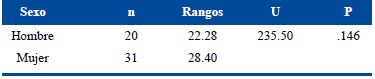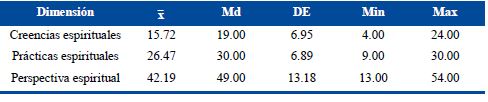 La muestra no siguió una distribución normal ( KS=0.250, p<0.05 ). Para comparar la heterogeneidad de la Perspectiva Espiritual por sexo se realizó la prueba de U de Mann Whitney, ya que la muestra no presentó una distribución normal, obteniendo que no hay diferencia estadísticamente significativa (p>0.05). Se obtuvo además que la edad no influye en el nivel de perspectiva espiritual ( rs=-0.047; p=0,741 ). De igual manera la edad no influye en las creencias espirituales (rs=-0.022; p=0.880) y tampoco influye en las prácticas espirituales (rs=-0.138; p=0.333).