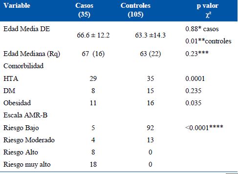Fueron hipertensas el 82,90% (casos) y 33,3% (controles), obesas el 31,40% (casos) y 15,2% (controles), diabéticas tipo II el 22,9% (casos) y 14,3% (controles) Tabla 1 .