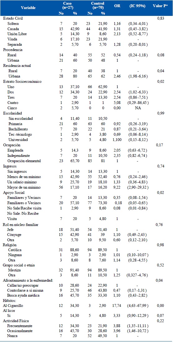 El ser casada fue el estado civil más frecuente en 42,90% (casos) y 41,90% (controles), procedentes de área urbana de diferentes municipios del departamento 60% (casos) y 48% (controles) y residentes en zona urbana 80% (casos) y 62% (controles) de estratos 1 y 2, 71,4% (casos) y 85,8% (controles), con una escolaridad primaria 60% (casos) y 60% (controles). Refirieron poseer ocupaciones elementales (amas de casa, pensionadas) 65,7% (casos) y 81% (controles), con un ingreso menor a un salario mínimo en 42,9% (casos) y 52,4% (controles). Reciben apoyo social de familiares y/o vecinos 77,10% (casos) y 86,6% (controles), son mujeres jefes cabeza de familia el 51,4% de casos y en el mismo porcentaje los controles, pertenecientes a la religión católica 88,60 (casos) y 89,50 (controles), predominó la raza mestiza en 91,4% (casos) y 89,5% (controles).