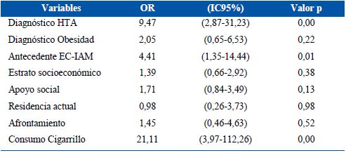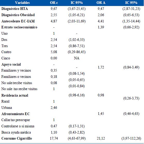 La asociación más fuerte para enfermedad coronaria se observó con el consumo de cigarrillo, el cual representa el riesgo más alto y que mostró un incremento de 3,37 al ajustarse por las variables más significativas del estudio (OR 21,11; IC 95% 3,97-112,26) entre los factores asociados.