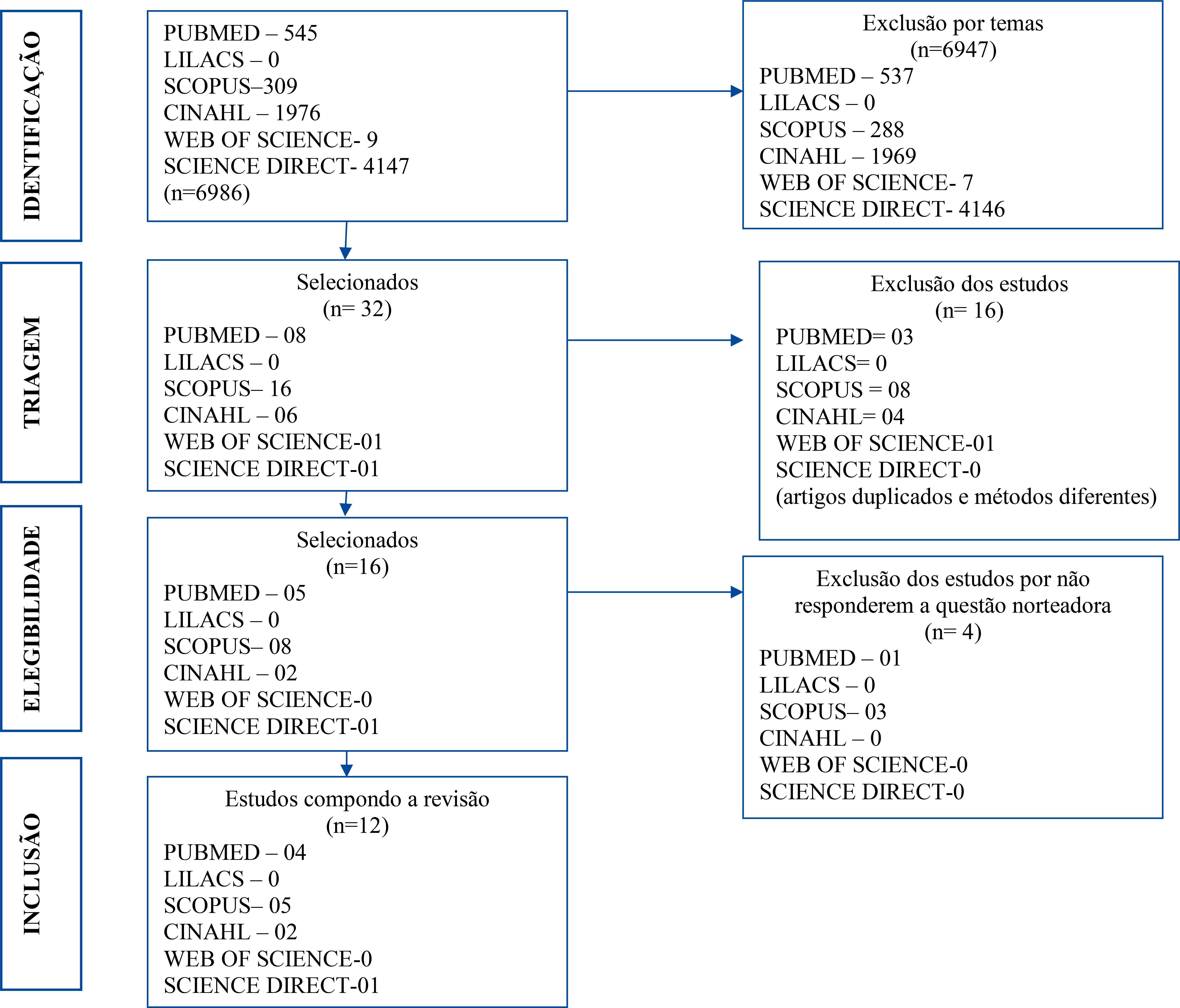 Na primeira análise, após a leitura do título e resumo dos estudos primários (n=6986), os artigos que não indicavam nenhuma tecnologia educacional/intervenção educativa relacionada ao manejo do RN foram excluídos (n=6947). Dentre eles: tecnologias digitais voltadas para o ensino materno, patologias neonatais e pediátricas, satisfação com o uso das tecnologias, eficácia de tratamentos, aspectos emocionais relacionados à Unidade de Terapia Intensiva Neonatal (UTIN) e temas não relacionados. Na segunda análise, por meio da leitura do artigo na íntegra (n=32), excluiu-se 16 artigos que se encontravam duplicados e quatro foram excluídos por não responderem à questão norteadora, relacionados ao uso de tecnologias educacionais voltadas ao ensino de profissionais para a assistência ao RN nas comunidades e ambulatórios. As análises foram desenvolvidas de forma independente por duas revisoras. ( Figura 1 )