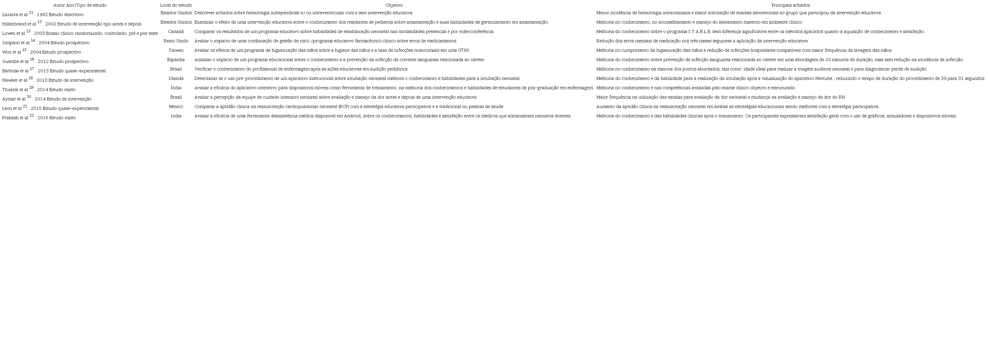 Os 12 estudos foram produzidos em sua maioria em países de língua inglesa, cujos objetivos de pesquisa eram, predominantemente, avaliar o efeito das intervenções educativas sobre os conhecimentos, habilidades e prática clínica relacionada ao RN enfermo, conforme Quadro 1 .
