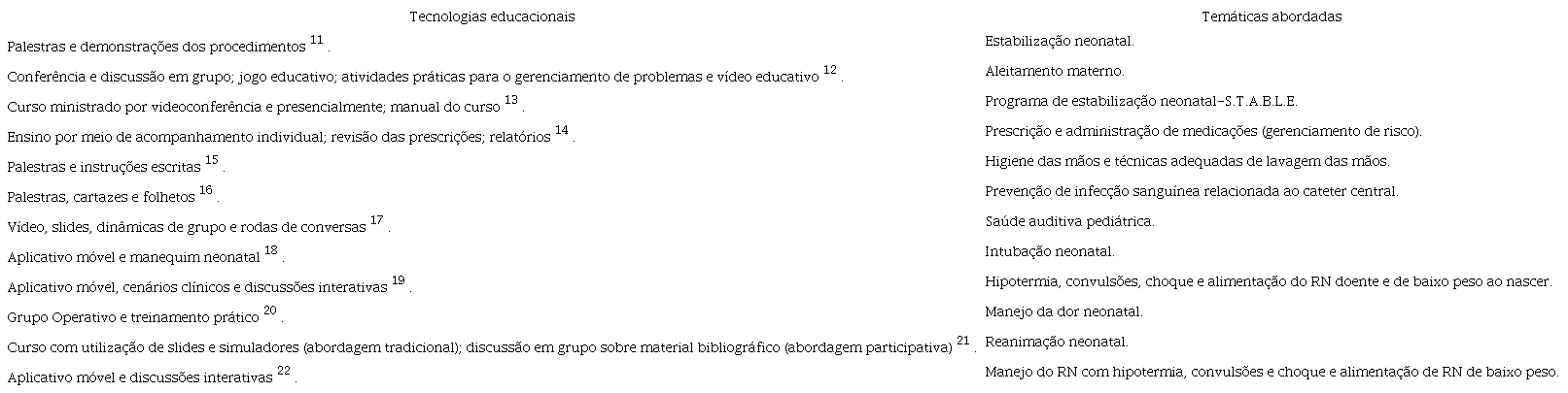 Results: Studies used different teaching technologies, from traditional to active methodologies, with the exposure to printed educational materials as well as information and communication technology. Most studies indicated an improvement of knowledge, skills and compliance with guidelines related to critical care of newborns.
