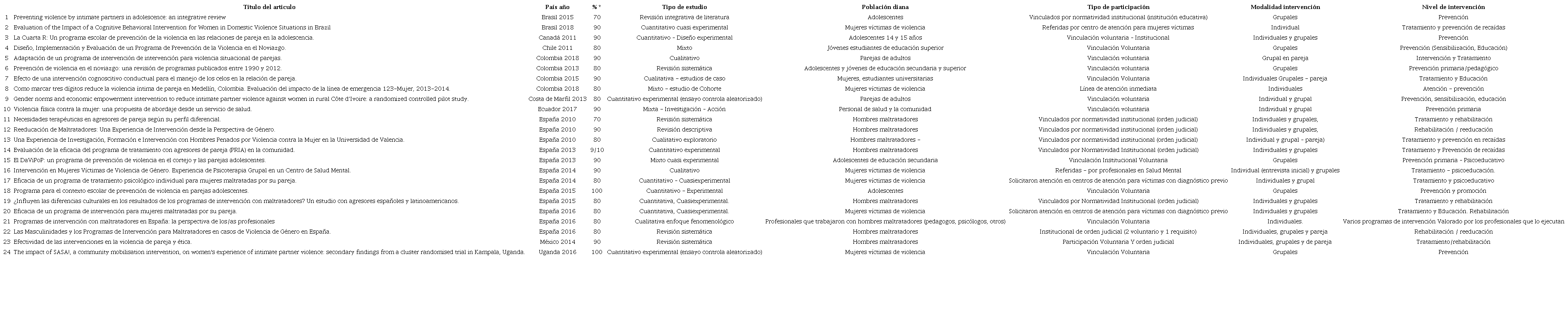 Resultados: Se seleccionaron 24 originados en Europa, Latinoamérica y África. Reportan principalmente intervenciones a nivel de psicoeducación desde la perspectiva de género y el modelo piramidal realizadas con hombres, mujeres víctimas y parejas adultas, así como con adolescentes y profesionales. La psico educación se orientó a reflexionar sobre las creencias culturalmente asociadas a los roles de género.