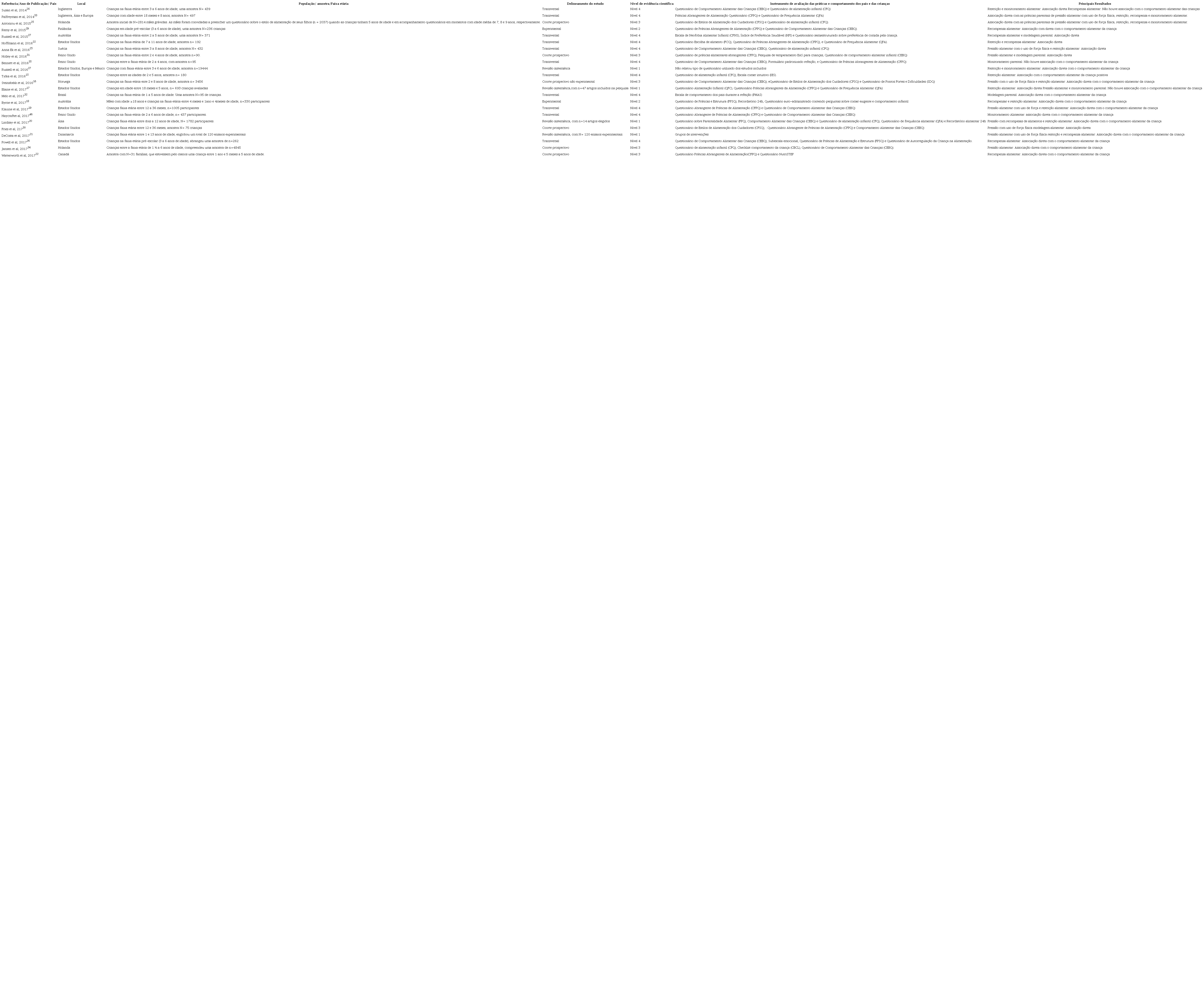 Jansen et al.34 em um estudo de coorte prospectivo, englobando 4845 crianças holandesas, entre um a seis anos de idade, avaliaram o comer compulsivo das crianças e a vontade de comer dos pais. Observaram que a prática parental de pressão para a criança se alimentar correlacionou-se positivamente com todas as avaliações, criança seletiva para comer, menor tempo de amamentação e comer na ausência de fome (r = 0,30), e associou-se positivamente com um menor IMC infantil (p<0,001), ou seja, as crianças cujo os pais realizam práticas pressão para comer, essas tinham um menor IMC . Cabe ressaltar que esse estudo é fortalecido por sua grande amostra, além disso, utilizou um delineamento prospectivo com dados coletados em várias fases da avaliação, permitindo compreender os efeitos de longo prazo dos comportamentos alimentares das crianças e prática alimentares dos pais. Realizou-se outro estudo de coorte prospectivo, no Canadá com 31 famílias, que estivessem pelo menos uma criança na faixa etária de um a cinco anos de idade, e corroborou as associações entre práticas parentais de pressão e monitoramento aos filhos seletivos, ou seja, aqueles que tinham baixa ingestão de alimentos saudáveis21. Constatou-se a associação direta entre recompensas alimentares utilizadas pelas mães, aos filhos que recusavam comer alimentos saudáveis, e essas comerem na ausência de fome (p <0,001). Também foram encontradas associações entre práticas parentais de pressão com uso de força física e restrição alimentar aos filhos que rejeitavam comer alimentos saudáveis (p=0,03), enquanto que as práticas parentais de modelagem foram associadas ao consumo aumentado de alimentos saudáveis pelas crianças (p<0,001). Destaca-se que o estudo trabalhou com variáveis independentes, como as múltiplas práticas parentais em relação à alimentação infantil, e variáveis dependentes como nível socioeconômico, idade, sexo da criança, tempo de aleitamento materno e índice de massa corporal dos pais (IMC), no entanto, com uma amostra relativamente pequena de 31 crianças.