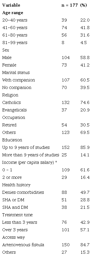 177 patients were investigated by analyzing their medical records, the majority of whom were male (58.8%), with an average age of 54 years, married (60.5%), retired (69.5%), with an income of up to one minimum wage (61.6%). Most were Catholic (74.6%) and had up to nine years of study (85.9%). Regarding the duration of treatment, most (57.1%) had more than 3 years on hemodialysis and used arteriovenous fistula to perform the therapy (84.7%). About the comorbidities, the most (49.7%) did not have them (Table 1).