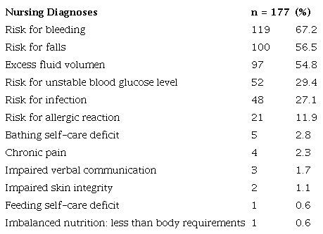 Twelve nursing diagnoses were identified, according to the NANDA-I taxonomy, and among these, the risk of bleeding, risk of falls and excessive fluid volume were the most frequent, presenting in 67.2%, 56.5% and 54.8% of patients according to documentation in medical records, respectively. The average number of diagnoses per patient was 2.61 (Table 2).