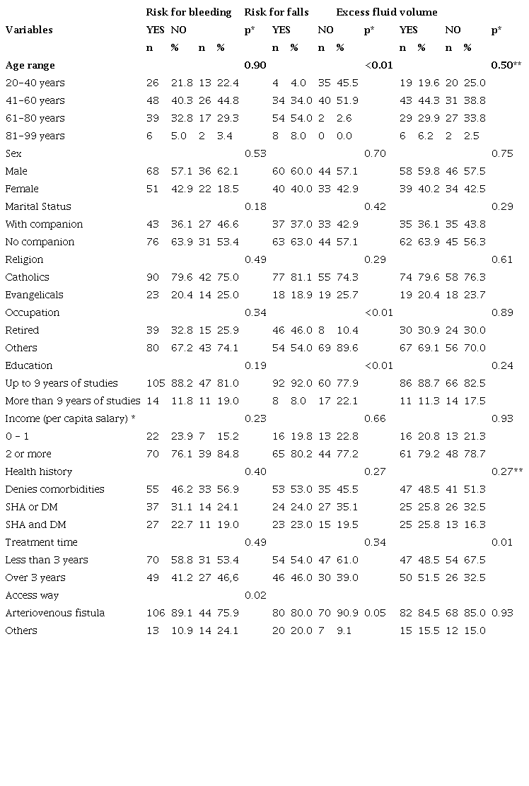 Results: Theriskforbleedingdiagnosisshowed a significant difference with the variable access route (p = 0.02); risk for falls was associated with the variables age, occupation, education (p <0.01) and excessive fluid volume with the variable duration of treatment (p = 0.01).