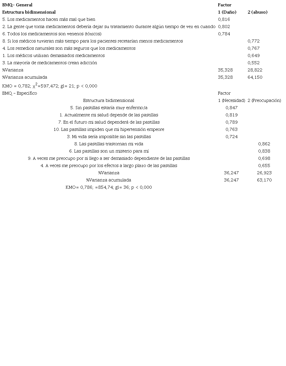 El BMQ en español fue adaptado y validado en España por Beléndez, et al24; para validar la sección BMQ-General, tomaron pacientes crónicos (n=156) y estudiantes universitarios (n= 256). El BMQ- Específico se estudió en 97 pacientes diabéticos tratados con insulina y 59 hipertensos tratados con antihipertensivos. La versión fue revisada aprobada por el autor de la versión original del BMQ. Los resultados comprobaron la estructura bifactorial del modelo teórico de la versión original para las dos subsecciones. En el análisis factorial exploratorio del BMQ-General en el grupo de pacientes crónicos (n = 156) resultó una estructura bifactorial que explicaba el 53% de la varianza total. En el BMQ-Específico para pacientes hipertensos resultó una estructura de dos factores que explicaron un 55% de la varianza total. Los índices de consistencia interna para el factor necesidad fue 0,47 y para el factor preocupación fue 0,35. Los resultados que apoyan la validez de constructo. Los autores recomiendan realizar otros estudios en pacientes con HTA por el reducido tamaño de la muestra (n =59).