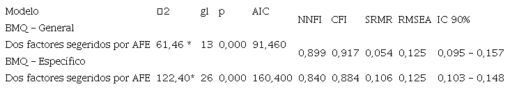 Con el resultado bifactorial obtenidos en el AFE se procedió al cálculo del AFC. Se comprobó la existencia de normalidad multivariada en los datos obtenidos, encontrando que los índices de asimetría y curtosis, registrados en la Tabla 2, son próximos al valor cero y por debajo del valor 1.96; De igual modo, se comprobó la normalidad multivariada de los datos a través del coeficiente de Mardia para los ítems en BMQ-General y Específico que fue de 12.643 y 24.775, respectivamente.