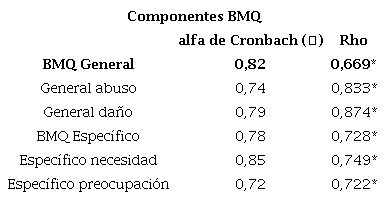 La confiabilidad se evaluó calculando la consistencia interna de cada subescala y factor a través del índice alfa de Cronbach. Se espera un valor igual o superior a 0.70 para considerar que el BMQ es confiable para usar en investigación32.
