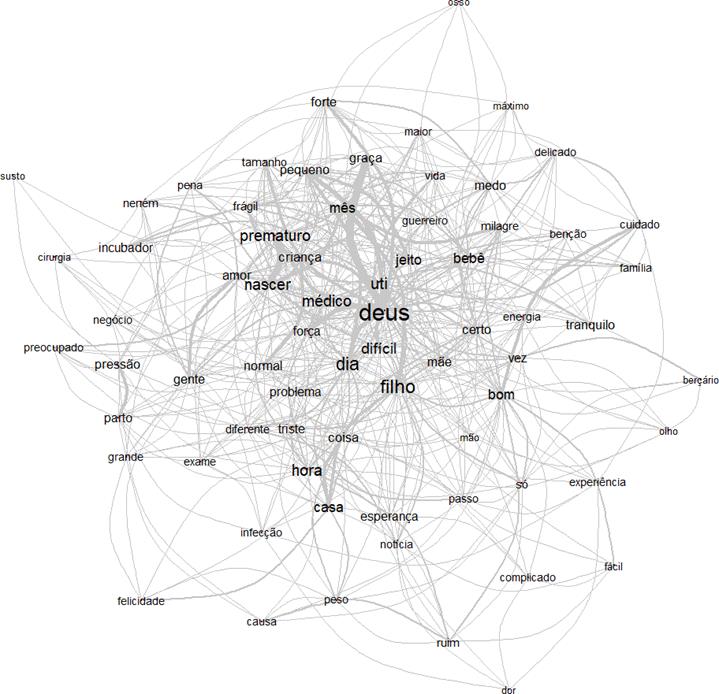 A partir dessa análise baseada na teoria dos grafos é possível identificar as ocorrências entre as palavras e as indicações de conexidade entre estas, auxiliando na identificação da estrutura do conteúdo de um corpus textual12. Observa-se as palavras de mais destaque nos discursos:“Deus”, “filho”e“prematuro”; e delas se ramificam outras que apresentam expressões significativas, como: “UTI”, “médico”, “difícil”, “força”, “frágil” e “amor”. Na periferia apareceram as palavras: “pequeno”, “milagre”, “energia”, “triste”, “diferente” e “pena”; e nos extremos das ramificações contemplam as relações entre: “forte” e “delicado”; “cuidado” e “família”; “dor” e “felicidade”.