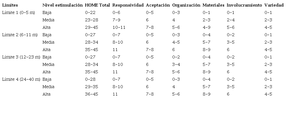 Los ítems se puntean con 0 (-) y 1 (+) mostrando ausencia o presencia de lo estipulado en el ítem17. Los puntajes se categorizan según el puntaje total y por subescalas en nivel de estimulación alto, medio y bajo, los cuales tienen límites de acuerdo al rango de edad en que se encuentra el infante (medido en meses), estas puntuaciones se muestran en la Tabla 1.