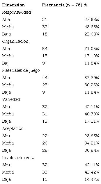 El alfa de Cronbach de la versión para infantes utilizada en este estudio, que está conformada por 45 reactivos, es de 0,773 en su puntuación total; y para cada una de las dimensiones: Responsividad (alfa: 0,709), Aceptación (alfa 0,621), Organización (alfa 0,421), Materiales de juego (alfa 0,648), involucramiento (alfa 0,661), Variedad (alfa 0,667)16.