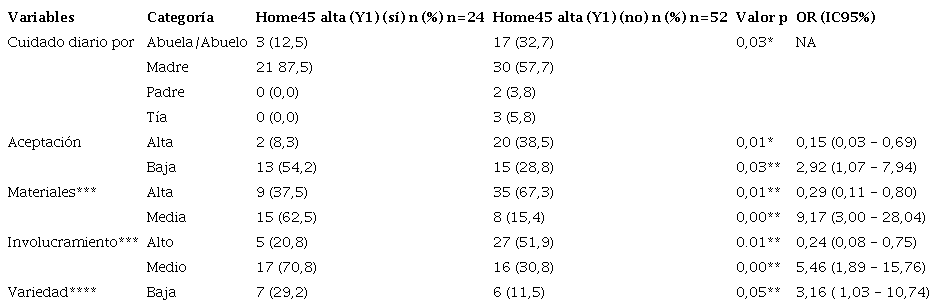 Al medir con el instrumento HOME45 el grado de estimulación total que recibía el niño en casa por parte de su cuidador principal, predominó la estimulación “alta” (Y ) (50%, n=38), seguida por “media” (Y ) (31,58%, n=24), y sólo un 18,42% (n=14) presentó baja estimulación (Y3). El análisis descriptivo de los puntajes totales de las dimensiones se detalla en la Tabla 2.