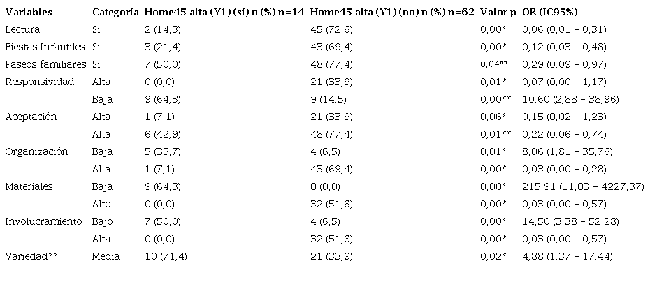 Materials and Methods: A cross-sectional study was conducted by means of a census sampling including all children and caregivers who met the selection criteria (children with no history of neurological disorders and caregiver informed consent.) Sociodemographic and family variables were also measured. The Early Childhood HOME45 (Home Observation for Measurement of the Environment) inventory was administered. Univariate and bivariate analyses were carried out. Ordinal logistic regression was performed for associating predictors and total early stimulation score (high/medium/low).