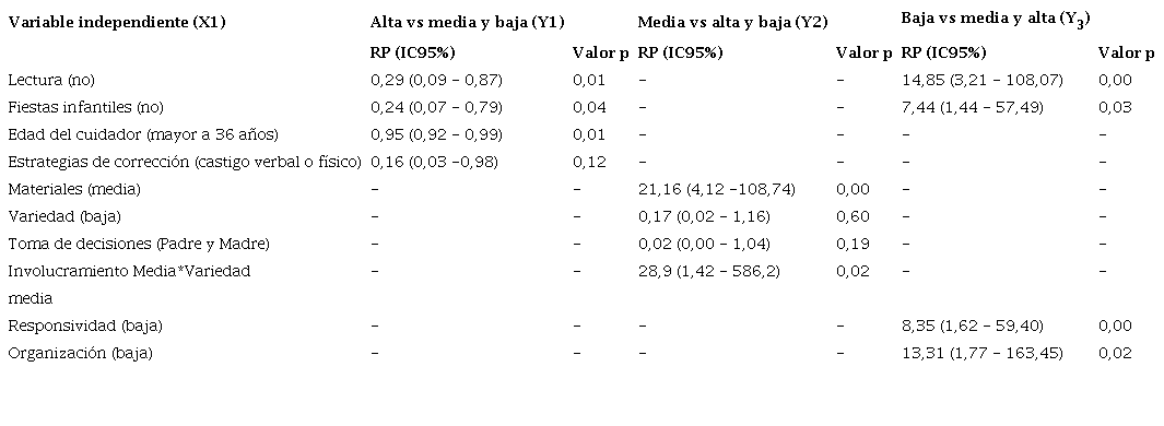 Para Y1 , cuando los cuidadores no leen a los niños, se reduce hasta en un 71% la oportunidad de presentar alta estimulación, en comparación con aquellos niños cuyos cuidadores sí les incentivan el hábito de la lectura. Por otra parte, cuando los cuidadores no llevan a los niños a fiestas infantiles, se reduce hasta en un 76% la oportunidad de presentar este desenlace, en comparación con aquellos niños que son incentivados para participar en fiestas infantiles por parte de sus cuidadores. Adicionalmente, por cada año de edad adicional por encima de la mediana (35 años) que tenga el cuidador, se reduce hasta en un 5% la oportunidad de presentar el desenlace, en comparación con aquellos niños con los cuidadores más jóvenes. Además, cuando los cuidadores emplean el castigo verbal o físico, se reduce hasta en un 84% la oportunidad de presentar alta estimulación, en comparación con aquellos niños cuyos cuidadores emplean el diálogo.