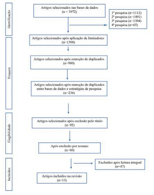 Após a aplicagáo dos critérios de inclusáo e exclusáo foram selecionados 13 artigos que representam a amostra, sendo que correspondem a base de dados EBSCOhost. (Fig. 1 - Fluxograma Prisma).