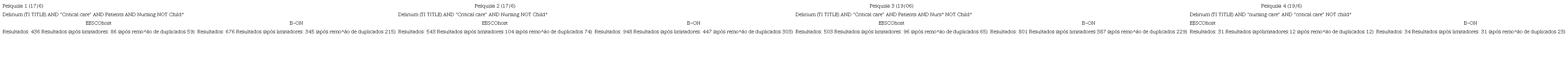 Foram Utilizadas para a selegáo de artigos, as seguintes combinagóes na língua inglesa, com os respetivos operadores booleanos (AND, NOT) e operador de truncamento (*): na primeira pesquisa foi utilizada a seguinte estratégia: Delirium (TI TITLE) AND “Critical Care” AND Patients AND Nursing NOT Child*. Na pesquisa seguinte: Delirium (TI TITLE) AND “Critical care” AND Nursing NOT Child*. Na terceira pesquisa: