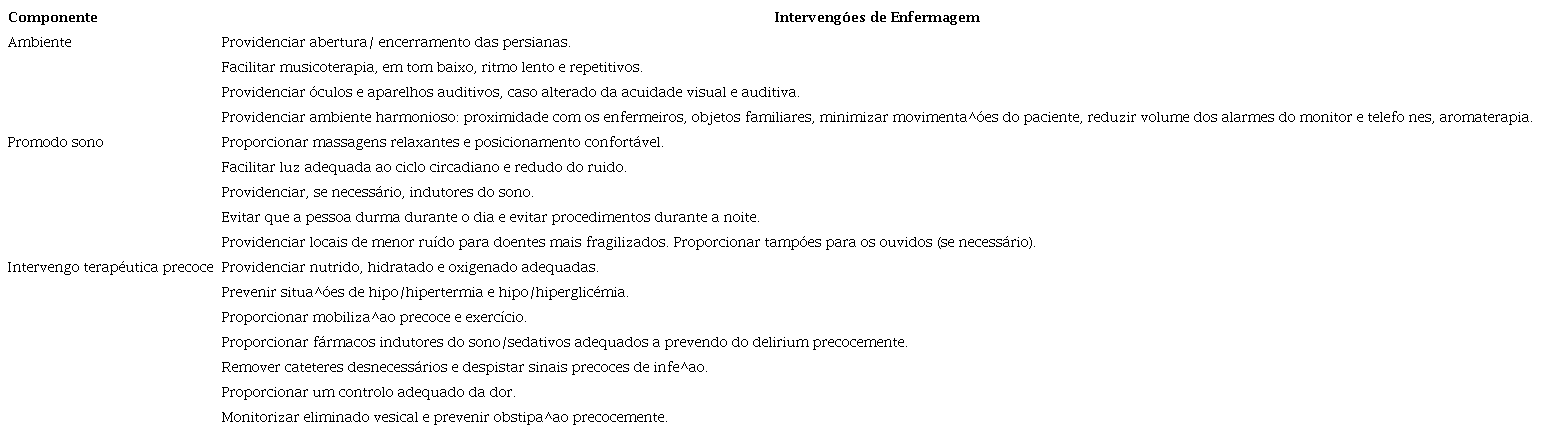 Deste modo, constatou-se que as intervengóes que surgiram com mais frequencia nos estudos selecionados foram as relacionadas com o ambiente, promotoras do sono e avaliagao cognitiva e orientagao dos pacientes.
