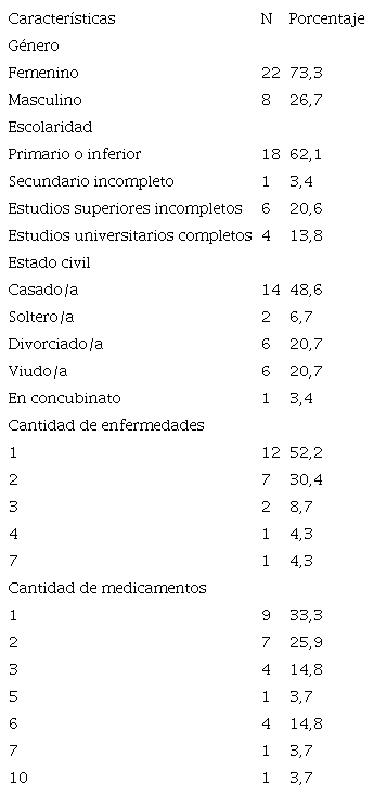 La población estuvo constituida por adultos mayores de 60 años, residentes en la zona este de la provincia de Mendoza, no institucionalizados, y sin diagnóstico de enfermedad psiquiátrica. La muestra fue seleccionada de manera no probabilística, utilizando el muestreo de participantes voluntarios. Participaron del estudio 30 sujetos de entre 60 y 82 años, con una edad media de 69,5 (d.e. 6,81). Predominó el sexo femenino, con un total de 22 mujeres y 8 varones. En cuanto a la escolaridad, la mayor parte de la muestra (el 62,1%) sólo tenía escolaridad primaria o inferior, el 3,4% tiene la escuela secundaria incompleta; el 20,6% estudios superiores incompletos, y el 13,8% estudios universitarios completos. La mayor parte de la muestra, el 48,6% está casada/o, el resto está soltero/a (6,7%), divorciado/a (20,7%), y viuda/o (20,7%). Con respecto a la situación laboral, de los 30 adultos mayores entrevistados, 25 eran jubiladas/os, 3 trabajadores activos/as y 2 pensionados/as; en promedio los participantes jubilados/as llevan 7,96 años en esta situación (d.e. 5,93).
