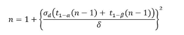 Por medio de la expresión anterior adoptando el mismo riesgo para el error tipo I y para el error tipo II, cuantificado en alfa= beta= 0,015. Por otra parte, se asumió como valor de A el 80% del valor de la desviación estándar, esto es, A= 0,8o. De esta manera al considerar los dos grupos que la investigación propone en su parte metodológica, k=2, el tamaño de la muestra requerido es de 41 pacientes en cada uno de los grupos16.