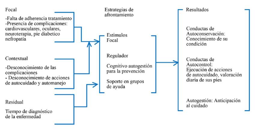 Discusión: las intervenciones de enfermería deben soportarse en enfoques teóricos propios de la disciplina, que permita visualizar resultados específicos, en este caso la autogestión la cual requiere de estrategias como el conocimiento, la habilidad y el soporte social que apoyaran la adaptación para las situaciones de enfermedad crónica.