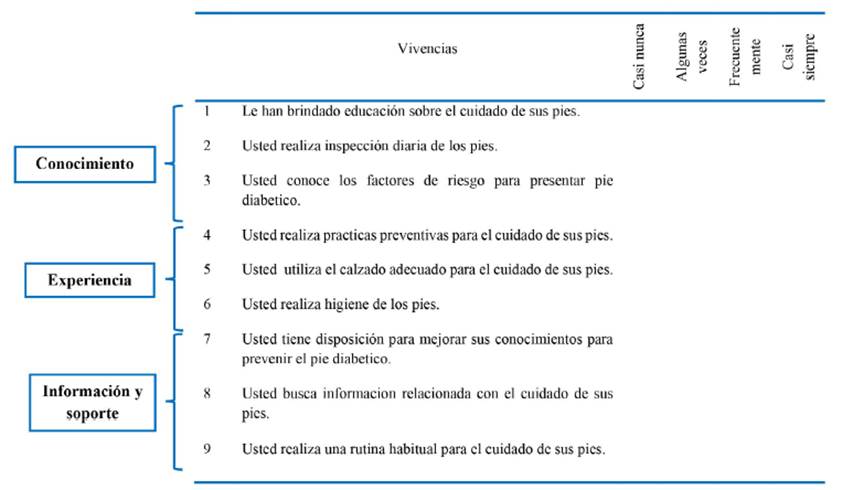 Se realizó el formato Ad Hoc el cual requirió hacer la primera validación de contenido, donde participaron 3 enfermeras expertas en la temática, 2 con maestría 1 con doctorado quienes trabajan con pacientes diabéticos y con heridas. Ellas realizaron la validez de contenido. Después de su revisión y retroalimentación se obtuvo el formato Ad hoc con un total de 9 ítems cuantificados por una escala tipo Likert de 1 a 4 donde 1 equivale a casi nunca, 2 algunas veces 3 frecuentemente 4 casi siempre para las tres dimensiones: conocimientos (3 ítems), experiencia (3 ítems), información y soporte (3 ítems) donde el valor mínimo obtenido de nivel de autogestión es 9 y el valor máximo 36. (Ver Figura 1).
