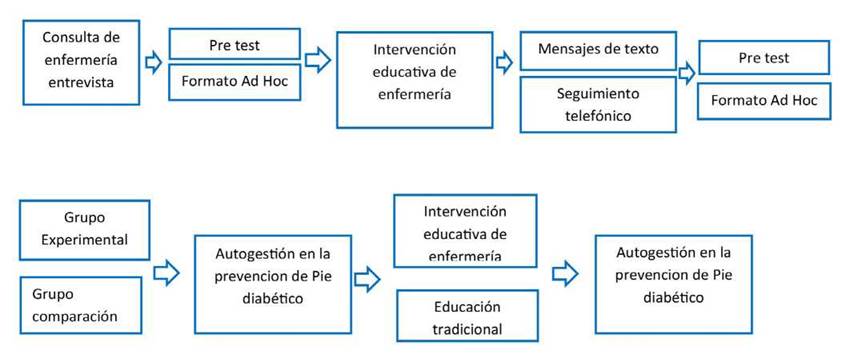 Tercera fase. Denominada autogestión anticipación al cuidado promover prácticas centradas en generar acciones de empoderamiento y frente a la enfermedad: se diseñaron 30 mensajes de texto acordes con los elementos de la autogestión: conocimiento, experiencia y soporte; estos mensajes tenían como objetivo evocar diferentes recordatorios para reforzar y generar conductas para el cuidado de sus pies. Los mensajes se enviaron 1 vez durante tres días a la semana por 4 semanas, los días lunes, miércoles y viernes y el día sábado por medio de una llamada telefónica se hacia el seguimiento y con ellos se confirmaba el recibido de los mismos. Luego de las 4ta semana de realizada la intervención se captaron nuevamente los participantes y se les realizo el pos test, en este orden de ideas la intervención tuvo una duración de 6 semanas desde su inicio hasta la finalización.