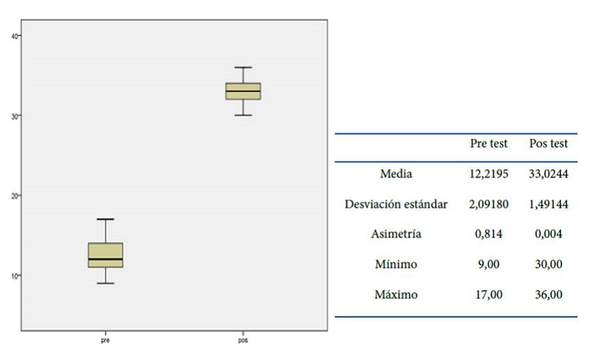 Respecto al análisis de los datos de las variables sociodemográficas, se utilizó una tabla de frecuencia y estadística descriptiva que permitió contextualizar la información de los participantes tanto del grupo experimental como del grupo comparación. Se determinó el nivel de significancia, se emplearon las pruebas no paramétricas Wiconxon y la prueba por resultados de U de Mann Whitney con el fin de comparar los puntajes y la diferencia entre grupos. La base de datos fue almacenada en Mendeley Data15.