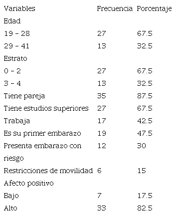 Participaron 40 mujeres gestantes de Santa Marta, Colombia, entre 19 y 41 años de edad M=26.48; DE=5.03. El 67% vivía en estrato socioeconómico entre 0 y 2, el 87.5% tenía pareja, el 67.5% había alcanzado el nivel de estudios superiores y el 42.5% trabajaba o realizaba alguna actividad remunerada.