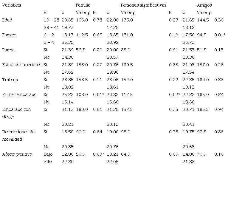 Respecto a los análisis comparativos según variables sociodemográficas, se encontró que las mujeres gestantes con estrato socioeconómico medio-alto (3 y 4) percibían mayor apoyo social por parte de sus amigos, en comparación con las mujeres que vivían en estratos bajos (0 a 2) (U=94.5; p=0.01). Las demás variables no mostraron diferencias estadísticamente significativas en las dimensiones del apoyo social percibido (Tabla 2).
