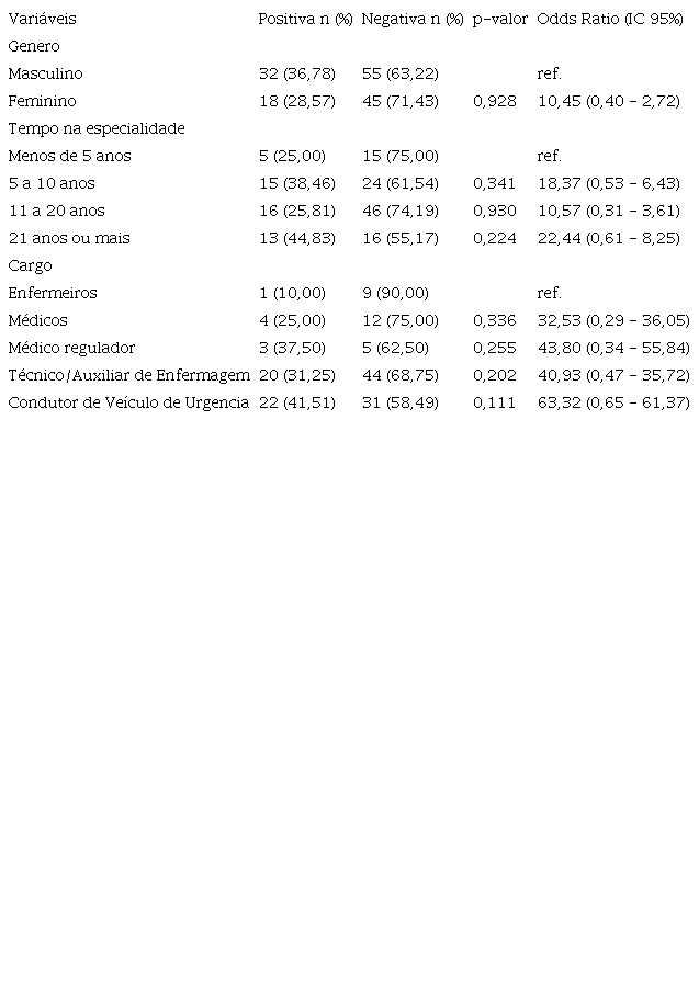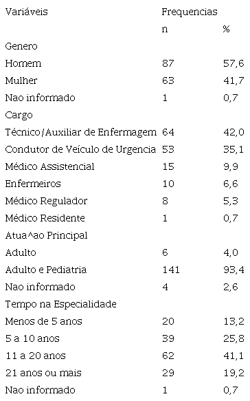 Participaram deste estudo 151 dos 160 profissionais elegíveis; as nove perdas se deram em razáo de recusa e o estudo contou com taxa de resposta de 94,3%. Predominaram participantes do sexo masculino (54,6%) e o cargo de auxiliares e técnicos de enfermagem (42,0%). Os profissionais relataram atuagáo em APH móvel por período superior a 10 anos (61,0%) e atuagáo em atendimentos para adultos e pediatria (93,4%). Todos os participantes possuem vínculo empregatício efetivo, selecionados por meio de concurso público municipal (Tabela 1).
