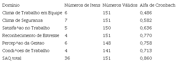 O domínio Percepgáo da Gestáo, originalmente, é composto por duas partes, Administragáo da unidade e Administragáo do hospital16. Para efeito deste estudo, náo foram considerados os cinco itens relacionados a Administrado do hospital, uma vez que náo sáo aplicáveis ao cenário de estudo. Desta forma, foram considerados 36 itens e nos seis domínios do SAQ.