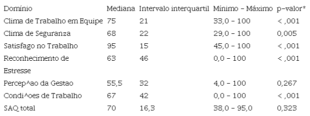 Para cada um dos itens, os participantes foram solicitados a responder baseados em uma escala de concordancia de 5 pontos, sendo que o escore varia de 0 a 100, em que zero é a pior percepgáo do clima de seguranga e 100 a melhor percepgáo. Para cada um dos domínios foram calculadas as médias, considerando válido para o cálculo, aqueles com preenchimento de, pelo menos, 50% dos itens do domínio. Para análise do valor final, SAQ total, os valores iguais ou superiores a 75 foram considerados como de forte concordancia em questóes de seguranga do paciente, classificados como atitude de seguranga positiva, enquanto valores inferiores a 75 foram classificados como atitude de seguranga negativa16.