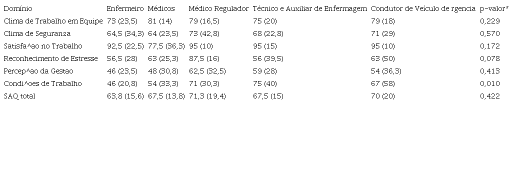 Materials and Methods: Cross-sectional study, conducted in a Mobile Pre-Hospital Care. Data collection was performed through Safety attitudes Questionnaire (SAQ), with convenience sampling and participation rate of 94.3% of eligible professionals. Descriptive statistics and the Mann- Whitney test were used for data analysis.
