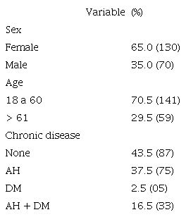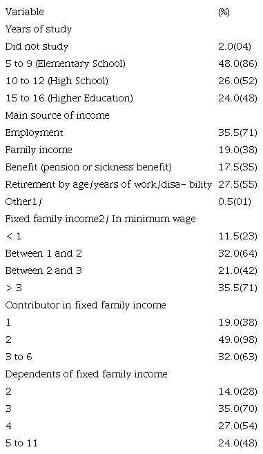 As for the years of study, there was a predominance of people with up to nine years of schooling, 48.0%. As for the main source of income, employment predominated in 35.5%, and retirement by age/ years of work stood out with 27.5% participants. When asked about the value of fixed family income, 35.5% reported income above three minimum wages. As for the number of people who contribute to the production of fixed family income, 49.0% mentioned two people, while three dependents on fixed family income predominated in 35.0% (Table 3).